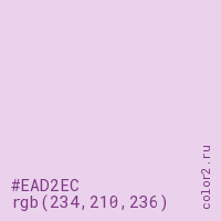 Цвет #EAD2EC в цветовой модели RGB обозначается тремя октетами (234, 210, 236) в десятичном формате и #EAD2EC в шестнадцатиричном (hex) формате, которые являются интенсивностью красного 234 (hex EA), интенсивность зелёного 210 (hex D2) и интенсивность синего 236 (hex EC).