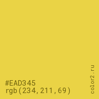 Цвет #EAD345 в цветовой модели RGB обозначается тремя октетами (234, 211, 69) в десятичном формате и #EAD345 в шестнадцатиричном (hex) формате, которые являются интенсивностью красного 234 (hex EA), интенсивность зелёного 211 (hex D3) и интенсивность синего 69 (hex 45).
