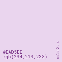 Цвет #EAD5EE в цветовой модели RGB обозначается тремя октетами (234, 213, 238) в десятичном формате и #EAD5EE в шестнадцатиричном (hex) формате, которые являются интенсивностью красного 234 (hex EA), интенсивность зелёного 213 (hex D5) и интенсивность синего 238 (hex EE).