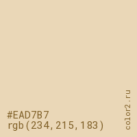 Цвет #EAD7B7 в цветовой модели RGB обозначается тремя октетами (234, 215, 183) в десятичном формате и #EAD7B7 в шестнадцатиричном (hex) формате, которые являются интенсивностью красного 234 (hex EA), интенсивность зелёного 215 (hex D7) и интенсивность синего 183 (hex B7).
