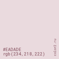 Цвет #EADADE в цветовой модели RGB обозначается тремя октетами (234, 218, 222) в десятичном формате и #EADADE в шестнадцатиричном (hex) формате, которые являются интенсивностью красного 234 (hex EA), интенсивность зелёного 218 (hex DA) и интенсивность синего 222 (hex DE).
