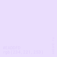 Цвет #EADDFD в цветовой модели RGB обозначается тремя октетами (234, 221, 253) в десятичном формате и #EADDFD в шестнадцатиричном (hex) формате, которые являются интенсивностью красного 234 (hex EA), интенсивность зелёного 221 (hex DD) и интенсивность синего 253 (hex FD).