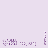 Цвет #EADEEE в цветовой модели RGB обозначается тремя октетами (234, 222, 238) в десятичном формате и #EADEEE в шестнадцатиричном (hex) формате, которые являются интенсивностью красного 234 (hex EA), интенсивность зелёного 222 (hex DE) и интенсивность синего 238 (hex EE).
