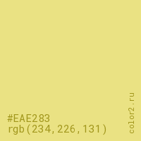 Цвет #EAE283 в цветовой модели RGB обозначается тремя октетами (234, 226, 131) в десятичном формате и #EAE283 в шестнадцатиричном (hex) формате, которые являются интенсивностью красного 234 (hex EA), интенсивность зелёного 226 (hex E2) и интенсивность синего 131 (hex 83).