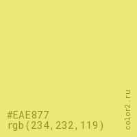 Цвет #EAE877 в цветовой модели RGB обозначается тремя октетами (234, 232, 119) в десятичном формате и #EAE877 в шестнадцатиричном (hex) формате, которые являются интенсивностью красного 234 (hex EA), интенсивность зелёного 232 (hex E8) и интенсивность синего 119 (hex 77).