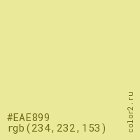 Цвет #EAE899 в цветовой модели RGB обозначается тремя октетами (234, 232, 153) в десятичном формате и #EAE899 в шестнадцатиричном (hex) формате, которые являются интенсивностью красного 234 (hex EA), интенсивность зелёного 232 (hex E8) и интенсивность синего 153 (hex 99).
