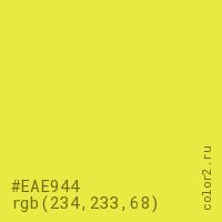 Цвет #EAE944 в цветовой модели RGB обозначается тремя октетами (234, 233, 68) в десятичном формате и #EAE944 в шестнадцатиричном (hex) формате, которые являются интенсивностью красного 234 (hex EA), интенсивность зелёного 233 (hex E9) и интенсивность синего 68 (hex 44).