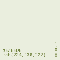 Цвет #EAEEDE в цветовой модели RGB обозначается тремя октетами (234, 238, 222) в десятичном формате и #EAEEDE в шестнадцатиричном (hex) формате, которые являются интенсивностью красного 234 (hex EA), интенсивность зелёного 238 (hex EE) и интенсивность синего 222 (hex DE).