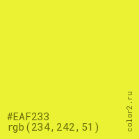 Цвет #EAF233 в цветовой модели RGB обозначается тремя октетами (234, 242, 51) в десятичном формате и #EAF233 в шестнадцатиричном (hex) формате, которые являются интенсивностью красного 234 (hex EA), интенсивность зелёного 242 (hex F2) и интенсивность синего 51 (hex 33).