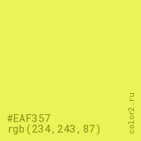 Цвет #EAF357 в цветовой модели RGB обозначается тремя октетами (234, 243, 87) в десятичном формате и #EAF357 в шестнадцатиричном (hex) формате, которые являются интенсивностью красного 234 (hex EA), интенсивность зелёного 243 (hex F3) и интенсивность синего 87 (hex 57).