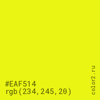 Цвет #EAF514 в цветовой модели RGB обозначается тремя октетами (234, 245, 20) в десятичном формате и #EAF514 в шестнадцатиричном (hex) формате, которые являются интенсивностью красного 234 (hex EA), интенсивность зелёного 245 (hex F5) и интенсивность синего 20 (hex 14).