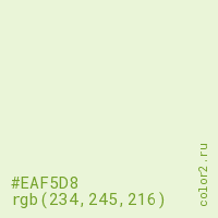 Цвет #EAF5D8 в цветовой модели RGB обозначается тремя октетами (234, 245, 216) в десятичном формате и #EAF5D8 в шестнадцатиричном (hex) формате, которые являются интенсивностью красного 234 (hex EA), интенсивность зелёного 245 (hex F5) и интенсивность синего 216 (hex D8).