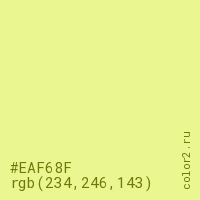 Цвет #EAF68F в цветовой модели RGB обозначается тремя октетами (234, 246, 143) в десятичном формате и #EAF68F в шестнадцатиричном (hex) формате, которые являются интенсивностью красного 234 (hex EA), интенсивность зелёного 246 (hex F6) и интенсивность синего 143 (hex 8F).