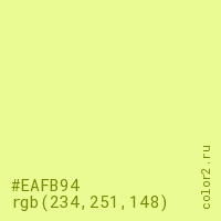 Цвет #EAFB94 в цветовой модели RGB обозначается тремя октетами (234, 251, 148) в десятичном формате и #EAFB94 в шестнадцатиричном (hex) формате, которые являются интенсивностью красного 234 (hex EA), интенсивность зелёного 251 (hex FB) и интенсивность синего 148 (hex 94).