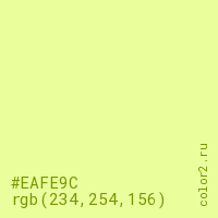 Цвет #EAFE9C в цветовой модели RGB обозначается тремя октетами (234, 254, 156) в десятичном формате и #EAFE9C в шестнадцатиричном (hex) формате, которые являются интенсивностью красного 234 (hex EA), интенсивность зелёного 254 (hex FE) и интенсивность синего 156 (hex 9C).