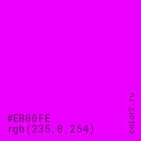 Цвет #EB00FE в цветовой модели RGB обозначается тремя октетами (235, 0, 254) в десятичном формате и #EB00FE в шестнадцатиричном (hex) формате, которые являются интенсивностью красного 235 (hex EB), интенсивность зелёного 0 (hex 00) и интенсивность синего 254 (hex FE).