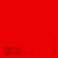 Цвет #EB0104 в цветовой модели RGB обозначается тремя октетами (235, 1, 4) в десятичном формате и #EB0104 в шестнадцатиричном (hex) формате, которые являются интенсивностью красного 235 (hex EB), интенсивность зелёного 1 (hex 01) и интенсивность синего 4 (hex 04).