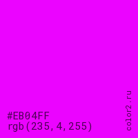 Цвет #EB04FF в цветовой модели RGB обозначается тремя октетами (235, 4, 255) в десятичном формате и #EB04FF в шестнадцатиричном (hex) формате, которые являются интенсивностью красного 235 (hex EB), интенсивность зелёного 4 (hex 04) и интенсивность синего 255 (hex FF).