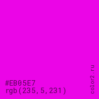Цвет #EB05E7 в цветовой модели RGB обозначается тремя октетами (235, 5, 231) в десятичном формате и #EB05E7 в шестнадцатиричном (hex) формате, которые являются интенсивностью красного 235 (hex EB), интенсивность зелёного 5 (hex 05) и интенсивность синего 231 (hex E7).