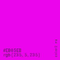 Цвет #EB05EB в цветовой модели RGB обозначается тремя октетами (235, 5, 235) в десятичном формате и #EB05EB в шестнадцатиричном (hex) формате, которые являются интенсивностью красного 235 (hex EB), интенсивность зелёного 5 (hex 05) и интенсивность синего 235 (hex EB).
