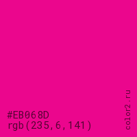 Цвет #EB068D в цветовой модели RGB обозначается тремя октетами (235, 6, 141) в десятичном формате и #EB068D в шестнадцатиричном (hex) формате, которые являются интенсивностью красного 235 (hex EB), интенсивность зелёного 6 (hex 06) и интенсивность синего 141 (hex 8D).