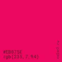 Цвет #EB075E в цветовой модели RGB обозначается тремя октетами (235, 7, 94) в десятичном формате и #EB075E в шестнадцатиричном (hex) формате, которые являются интенсивностью красного 235 (hex EB), интенсивность зелёного 7 (hex 07) и интенсивность синего 94 (hex 5E).