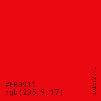 Цвет #EB0911 в цветовой модели RGB обозначается тремя октетами (235, 9, 17) в десятичном формате и #EB0911 в шестнадцатиричном (hex) формате, которые являются интенсивностью красного 235 (hex EB), интенсивность зелёного 9 (hex 09) и интенсивность синего 17 (hex 11).