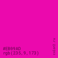 Цвет #EB09AD в цветовой модели RGB обозначается тремя октетами (235, 9, 173) в десятичном формате и #EB09AD в шестнадцатиричном (hex) формате, которые являются интенсивностью красного 235 (hex EB), интенсивность зелёного 9 (hex 09) и интенсивность синего 173 (hex AD).