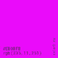 Цвет #EB0BFB в цветовой модели RGB обозначается тремя октетами (235, 11, 251) в десятичном формате и #EB0BFB в шестнадцатиричном (hex) формате, которые являются интенсивностью красного 235 (hex EB), интенсивность зелёного 11 (hex 0B) и интенсивность синего 251 (hex FB).