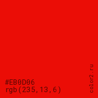 Цвет #EB0D06 в цветовой модели RGB обозначается тремя октетами (235, 13, 6) в десятичном формате и #EB0D06 в шестнадцатиричном (hex) формате, которые являются интенсивностью красного 235 (hex EB), интенсивность зелёного 13 (hex 0D) и интенсивность синего 6 (hex 06).