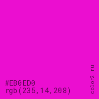 Цвет #EB0ED0 в цветовой модели RGB обозначается тремя октетами (235, 14, 208) в десятичном формате и #EB0ED0 в шестнадцатиричном (hex) формате, которые являются интенсивностью красного 235 (hex EB), интенсивность зелёного 14 (hex 0E) и интенсивность синего 208 (hex D0).