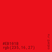 Цвет #EB101B в цветовой модели RGB обозначается тремя октетами (235, 16, 27) в десятичном формате и #EB101B в шестнадцатиричном (hex) формате, которые являются интенсивностью красного 235 (hex EB), интенсивность зелёного 16 (hex 10) и интенсивность синего 27 (hex 1B).