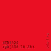 Цвет #EB1024 в цветовой модели RGB обозначается тремя октетами (235, 16, 36) в десятичном формате и #EB1024 в шестнадцатиричном (hex) формате, которые являются интенсивностью красного 235 (hex EB), интенсивность зелёного 16 (hex 10) и интенсивность синего 36 (hex 24).