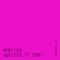 Цвет #EB11C8 в цветовой модели RGB обозначается тремя октетами (235, 17, 200) в десятичном формате и #EB11C8 в шестнадцатиричном (hex) формате, которые являются интенсивностью красного 235 (hex EB), интенсивность зелёного 17 (hex 11) и интенсивность синего 200 (hex C8).