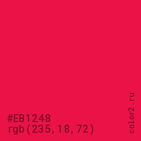 Цвет #EB1248 в цветовой модели RGB обозначается тремя октетами (235, 18, 72) в десятичном формате и #EB1248 в шестнадцатиричном (hex) формате, которые являются интенсивностью красного 235 (hex EB), интенсивность зелёного 18 (hex 12) и интенсивность синего 72 (hex 48).