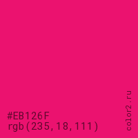 Цвет #EB126F в цветовой модели RGB обозначается тремя октетами (235, 18, 111) в десятичном формате и #EB126F в шестнадцатиричном (hex) формате, которые являются интенсивностью красного 235 (hex EB), интенсивность зелёного 18 (hex 12) и интенсивность синего 111 (hex 6F).