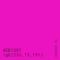 Цвет #EB13BF в цветовой модели RGB обозначается тремя октетами (235, 19, 191) в десятичном формате и #EB13BF в шестнадцатиричном (hex) формате, которые являются интенсивностью красного 235 (hex EB), интенсивность зелёного 19 (hex 13) и интенсивность синего 191 (hex BF).