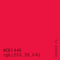 Цвет #EB1440 в цветовой модели RGB обозначается тремя октетами (235, 20, 64) в десятичном формате и #EB1440 в шестнадцатиричном (hex) формате, которые являются интенсивностью красного 235 (hex EB), интенсивность зелёного 20 (hex 14) и интенсивность синего 64 (hex 40).