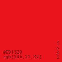 Цвет #EB1520 в цветовой модели RGB обозначается тремя октетами (235, 21, 32) в десятичном формате и #EB1520 в шестнадцатиричном (hex) формате, которые являются интенсивностью красного 235 (hex EB), интенсивность зелёного 21 (hex 15) и интенсивность синего 32 (hex 20).