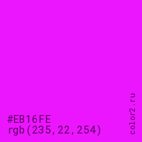 Цвет #EB16FE в цветовой модели RGB обозначается тремя октетами (235, 22, 254) в десятичном формате и #EB16FE в шестнадцатиричном (hex) формате, которые являются интенсивностью красного 235 (hex EB), интенсивность зелёного 22 (hex 16) и интенсивность синего 254 (hex FE).