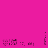 Цвет #EB1BA0 в цветовой модели RGB обозначается тремя октетами (235, 27, 160) в десятичном формате и #EB1BA0 в шестнадцатиричном (hex) формате, которые являются интенсивностью красного 235 (hex EB), интенсивность зелёного 27 (hex 1B) и интенсивность синего 160 (hex A0).