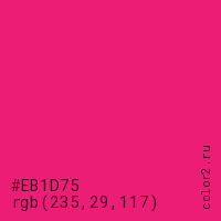 Цвет #EB1D75 в цветовой модели RGB обозначается тремя октетами (235, 29, 117) в десятичном формате и #EB1D75 в шестнадцатиричном (hex) формате, которые являются интенсивностью красного 235 (hex EB), интенсивность зелёного 29 (hex 1D) и интенсивность синего 117 (hex 75).