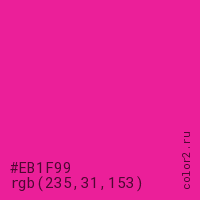 Цвет #EB1F99 в цветовой модели RGB обозначается тремя октетами (235, 31, 153) в десятичном формате и #EB1F99 в шестнадцатиричном (hex) формате, которые являются интенсивностью красного 235 (hex EB), интенсивность зелёного 31 (hex 1F) и интенсивность синего 153 (hex 99).