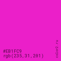 Цвет #EB1FC9 в цветовой модели RGB обозначается тремя октетами (235, 31, 201) в десятичном формате и #EB1FC9 в шестнадцатиричном (hex) формате, которые являются интенсивностью красного 235 (hex EB), интенсивность зелёного 31 (hex 1F) и интенсивность синего 201 (hex C9).