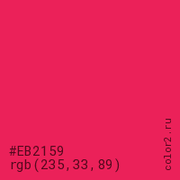 Цвет #EB2159 в цветовой модели RGB обозначается тремя октетами (235, 33, 89) в десятичном формате и #EB2159 в шестнадцатиричном (hex) формате, которые являются интенсивностью красного 235 (hex EB), интенсивность зелёного 33 (hex 21) и интенсивность синего 89 (hex 59).
