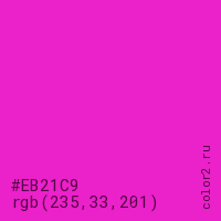 Цвет #EB21C9 в цветовой модели RGB обозначается тремя октетами (235, 33, 201) в десятичном формате и #EB21C9 в шестнадцатиричном (hex) формате, которые являются интенсивностью красного 235 (hex EB), интенсивность зелёного 33 (hex 21) и интенсивность синего 201 (hex C9).