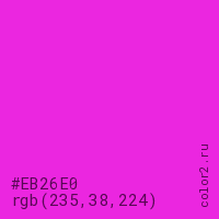 Цвет #EB26E0 в цветовой модели RGB обозначается тремя октетами (235, 38, 224) в десятичном формате и #EB26E0 в шестнадцатиричном (hex) формате, которые являются интенсивностью красного 235 (hex EB), интенсивность зелёного 38 (hex 26) и интенсивность синего 224 (hex E0).