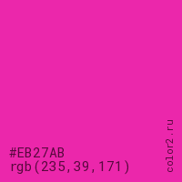 Цвет #EB27AB в цветовой модели RGB обозначается тремя октетами (235, 39, 171) в десятичном формате и #EB27AB в шестнадцатиричном (hex) формате, которые являются интенсивностью красного 235 (hex EB), интенсивность зелёного 39 (hex 27) и интенсивность синего 171 (hex AB).