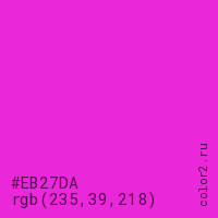 Цвет #EB27DA в цветовой модели RGB обозначается тремя октетами (235, 39, 218) в десятичном формате и #EB27DA в шестнадцатиричном (hex) формате, которые являются интенсивностью красного 235 (hex EB), интенсивность зелёного 39 (hex 27) и интенсивность синего 218 (hex DA).