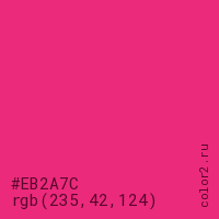 Цвет #EB2A7C в цветовой модели RGB обозначается тремя октетами (235, 42, 124) в десятичном формате и #EB2A7C в шестнадцатиричном (hex) формате, которые являются интенсивностью красного 235 (hex EB), интенсивность зелёного 42 (hex 2A) и интенсивность синего 124 (hex 7C).